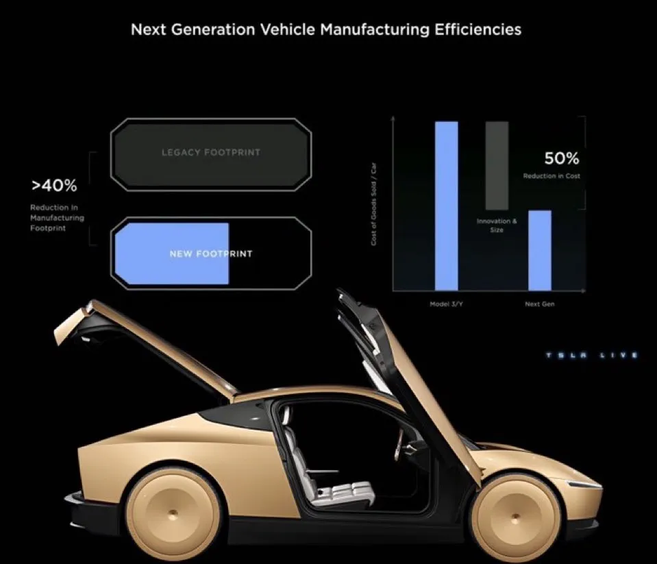 | モデルQ:新型コンパクトハッチバックモデル 2025年上半期に発表予定 ハンドルのついているCyberCabのようなモデル?コスト削減により、従来モデルの半分のコストで制作できるようになったらしい。 ![]() 効率的な生産をしているモデル3、モデルYよりも、さらに50%のコスト削減を実現 |