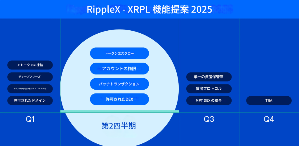 2025年Q1~Q4にかけて、「許可ドメイン」「単一資産Vault」「レンディングプロトコル」など、RippleXにより”金融機関むけDeFi”の実現に向けたXRP元帳機能提案が計画されています。